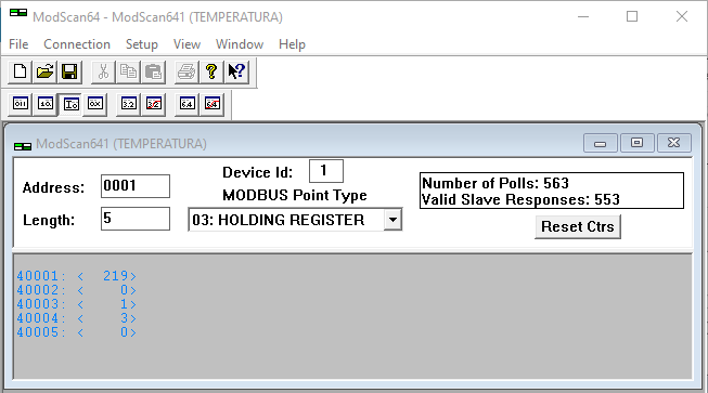 - 40001: Valor de la temperatura, hay que dividir el valor leído entre 10, para tener un decimal, por ejemplo, leemos 219, significa 21.9°C.