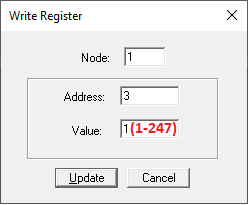 Si queremos modificar la dirección de comunicaciones, sólo hemos de clickar dos veces en la dirección 40003, nos saldrá una ventanita e introducimos el valor deseado (de 1 a 247, pongo 247, por qué es el máximo de dispositivos que indica el fabricante), damos a UPDATE y, perderemos la conexión, por lo que hemos de poner la nueva dirección en el Device ID del ModScan: